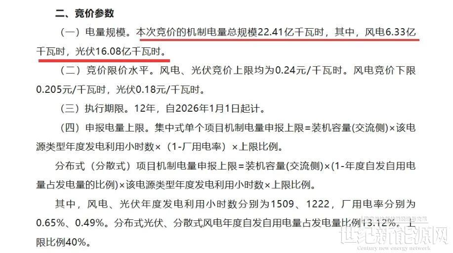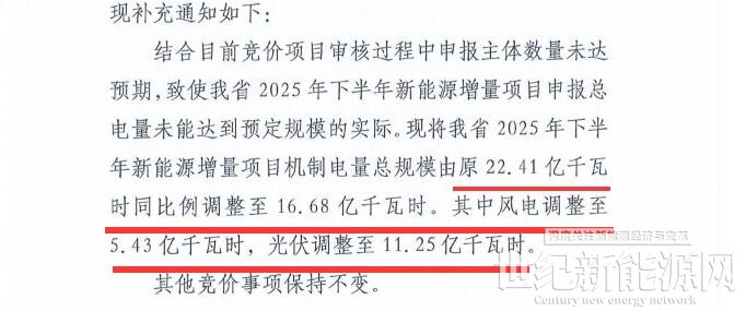 文件显示,结合目前竞价项目审核过程中申报主体数量未达预期,致使青海省2025年下半年新能源增量项目申报总电量未能达到预定规模的实际。现将青海省2025年下半年新能源增量项目机制电量总规模由原22.41亿千瓦时同比例调整至16.68亿千瓦时(减少了5.73亿千瓦时,减少25.6%)。其中风电调整至5.43亿千瓦时(原风电6.33亿千瓦时,减少0.9亿千瓦时,减少14.2%),光伏调整至11.25亿千瓦时(原光伏16.08亿千瓦时,减少4.83亿千瓦时,减少30.04%)。