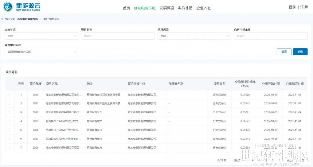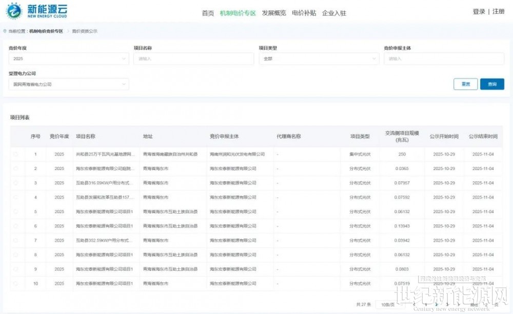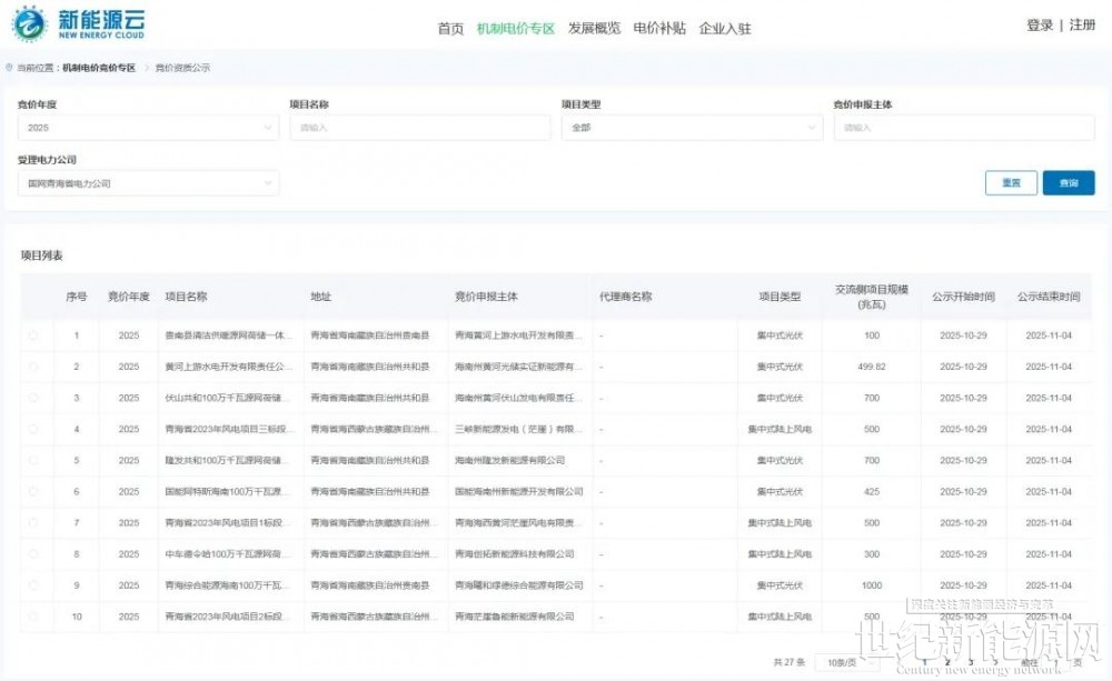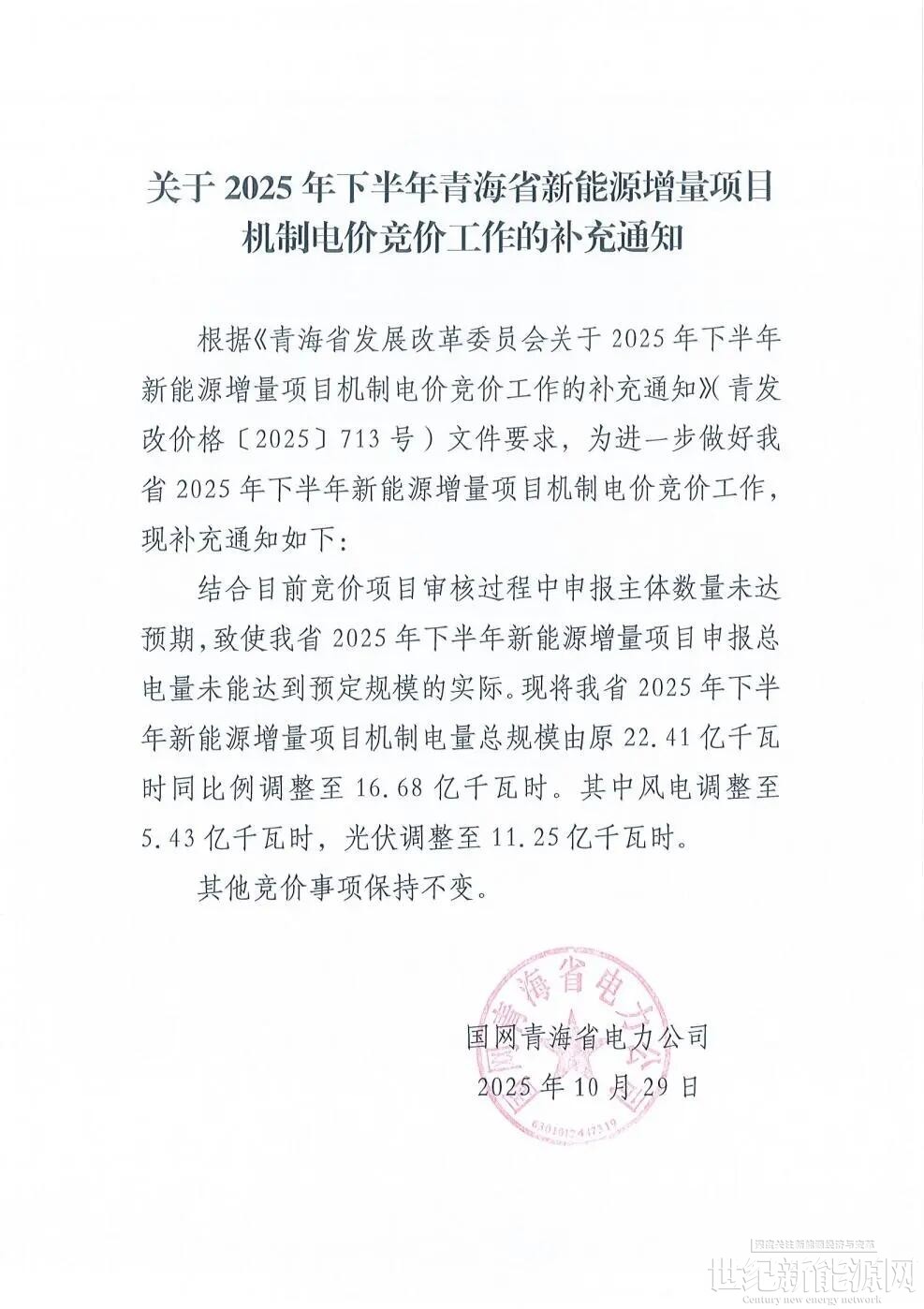 10月29日,国网新能源云发布关于2025年下半年青海省新能源增量项目机制电价竞价工作的补充通知。