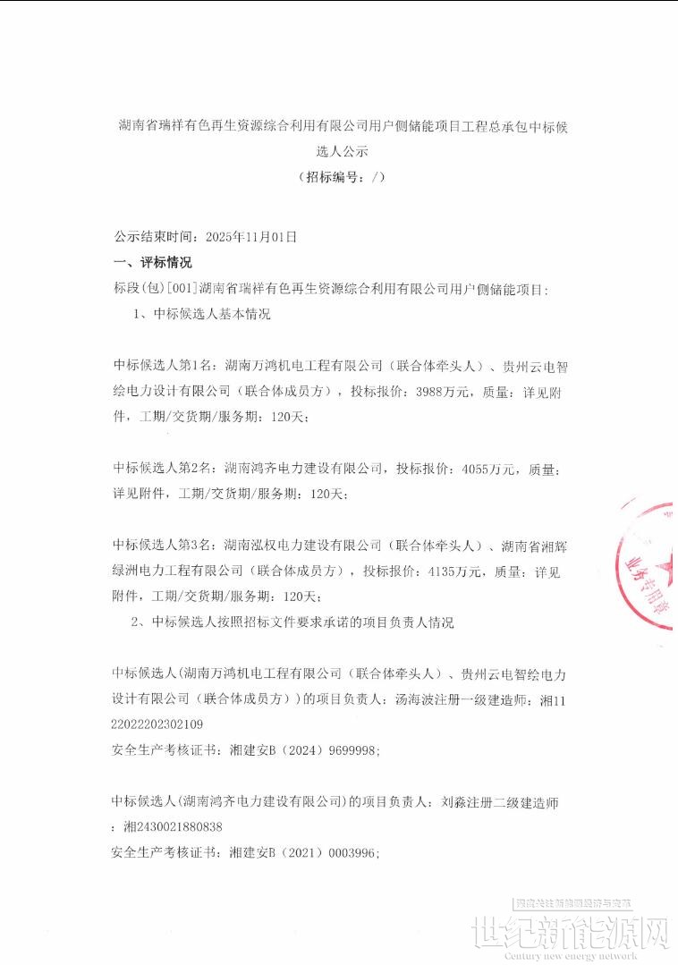 10月29日,湖南省瑞祥有色再生资源综合利用有限公司用户侧储能项目工程总承包中标候选人公示。