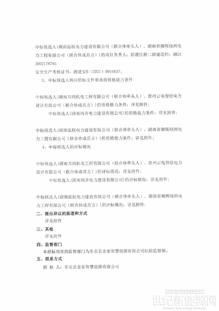 第一中标候选人为湖南万鸿机电工程有限公司(联合体牵头人)、贵州云电智绘电力设计有限公司(联合体成员方),投标报价39880000元,折合单价0.8862元/Wh;第二中标候选人为湖南鸿齐电力建设有限公司,投标报价40550000元,折合单价0.9011元/Wh;第三中标候选人为湖南泓权电力建设有限公司(联合体牵头人)、湖南省湘辉绿洲电力工程有限公司(联合体成员方),投标报价41350000元,折合单价0.9189元/Wh。
