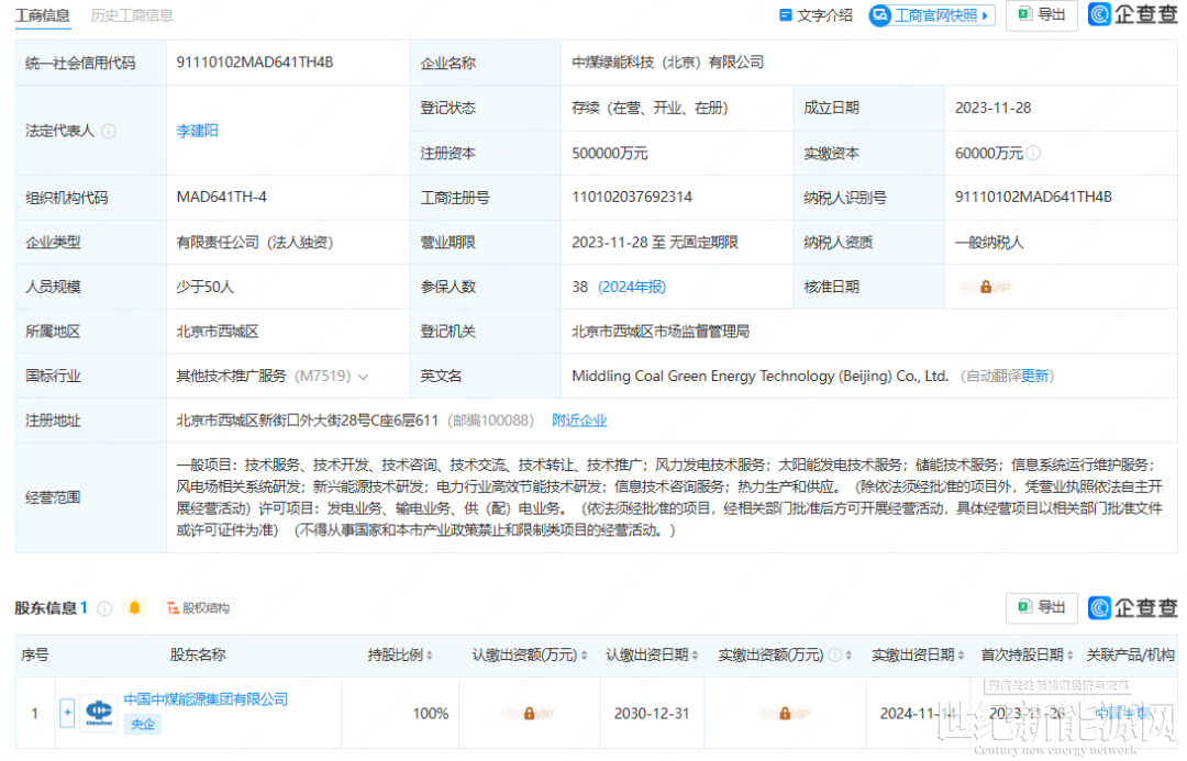 股东信息显示,该公司由中国中煤能源集团子公司中煤绿能科技(北京)有限公司全资持股。