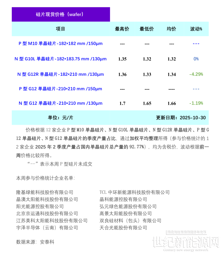 展望后市,终端需求进入传统淡季,下游电池及组件企业的采购意愿并不强烈,硅片市场仍呈现供大于求的态势。不过,预计自11月起,部分硅片企业有降低开工率的计划,市场供需关系有望逐步得到改善。同时,多数硅片企业挺价意愿十分强烈,且行业“反内卷”政策仍在有序推进,可能会对硅片市场形成一定程度的利好支撑。