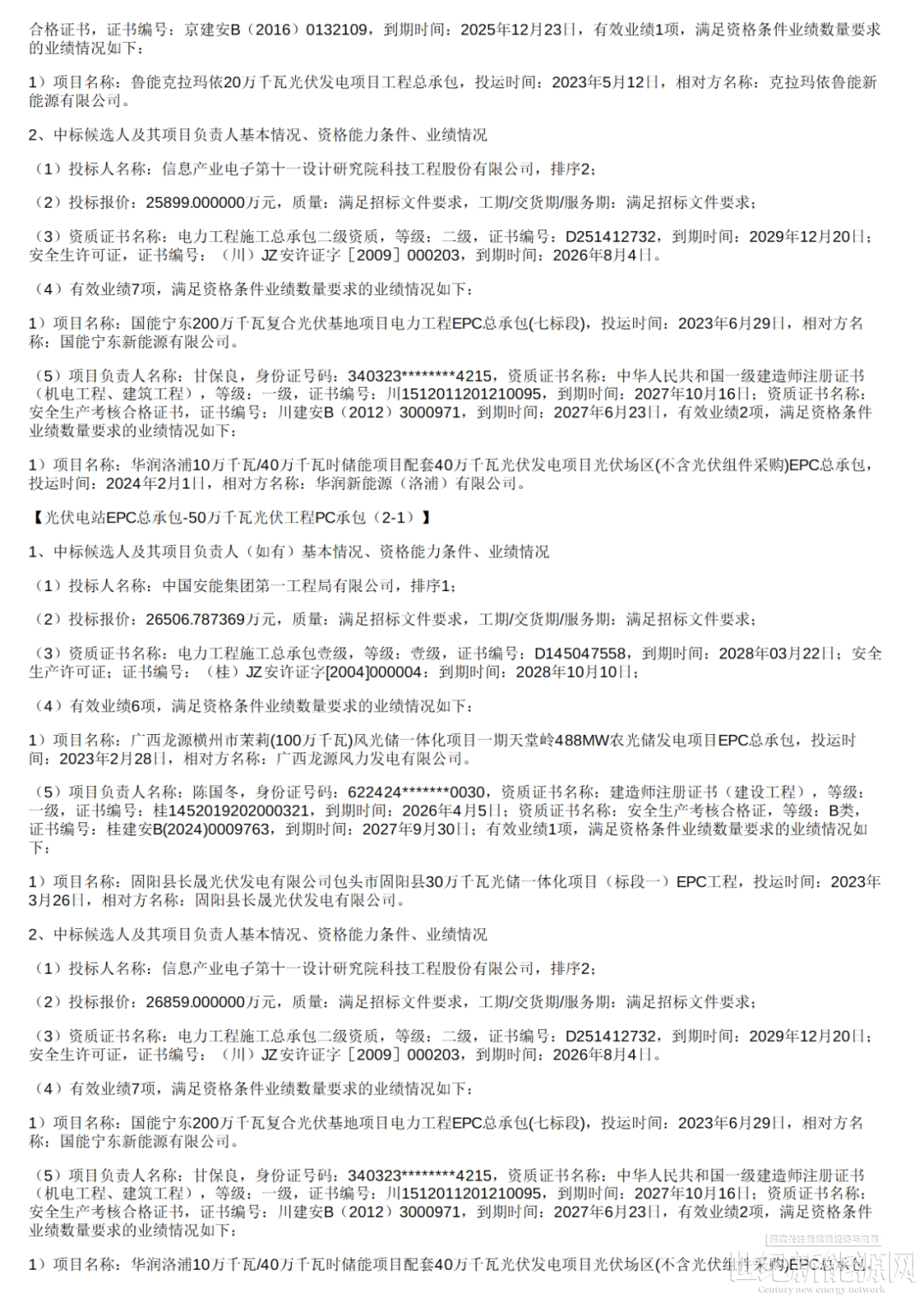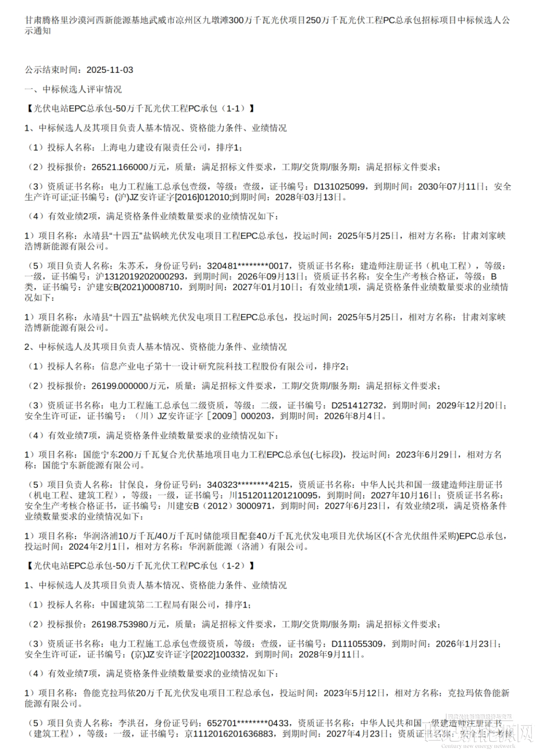 标段四50万千瓦,中国能源建设集团东北电力第三工程有限公司以0.557元/瓦位列第一候选人;
