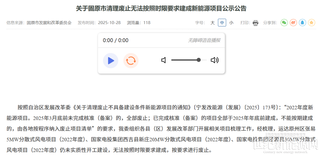 10月28日,固原市发展和改革委员会发布关于固原市清理废止无法按照时限要求建成新能源项目公示公告。