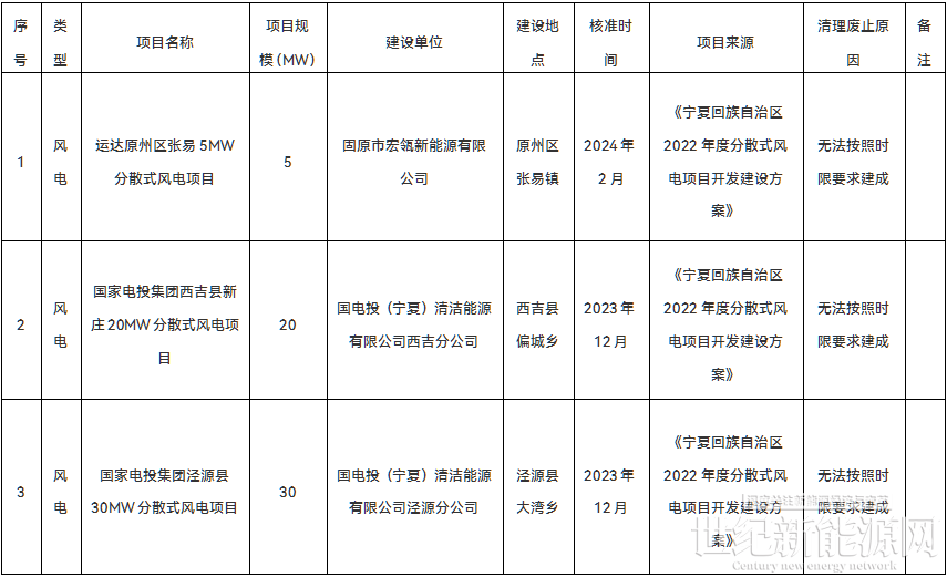 公告显示,经梳理,运达原州区张易5MW分散式风电项目(2022年度)、国家电投集团西吉县新庄20MW分散式风电项目(2022年度)、国家电投集团泾源县30MW分散式风电项目(2022年度)仍未实质性开工建设,无法按照时限要求建成,按要求进行废止。