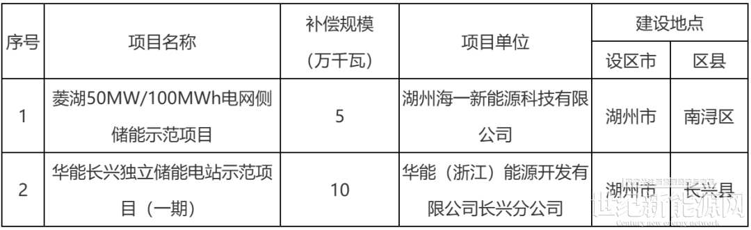 湖州市发展改革委关于公示湖州市电网侧新型储能容量补偿项目清单的通知