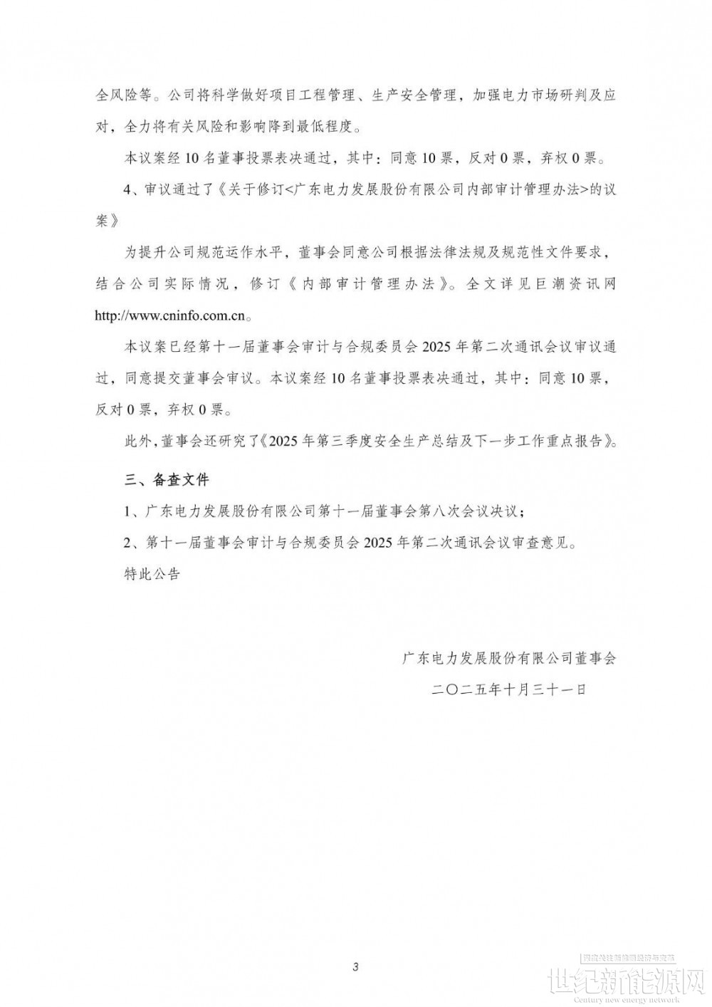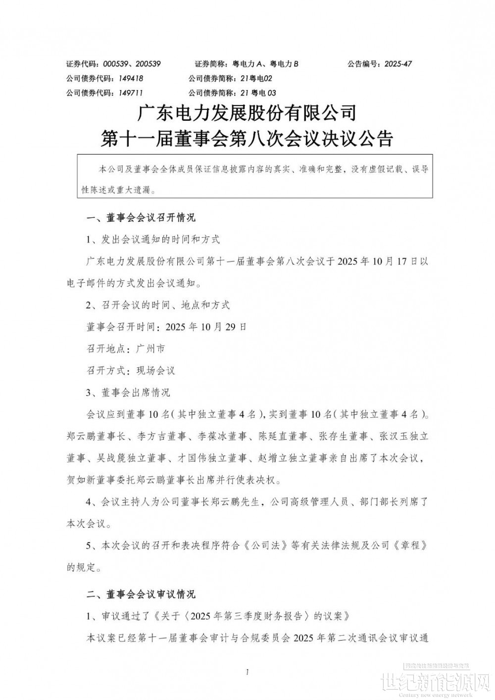 10月31日,广东电力发展股份有限公司发布第十一届董事会第八次会议决议公告。