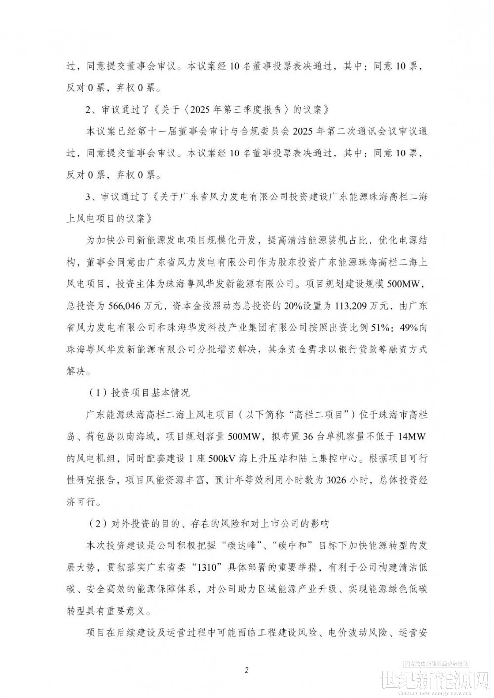 公告显示,粤电力于2025年10月29日召开第十一届董事会第八次会议,审议通过了《关于广东省风力发电有限公司投资建设广东能源珠海高栏二海上风电项目的议案》,为加快公司新能源发电项目规模化开发,提高清洁能源装机占比,优化电源结构,董事会同意由广东省风力发电有限公司作为股东投资广东能源珠海高栏二海上风电项目,投资主体为珠海粤风华发新能源有限公司。