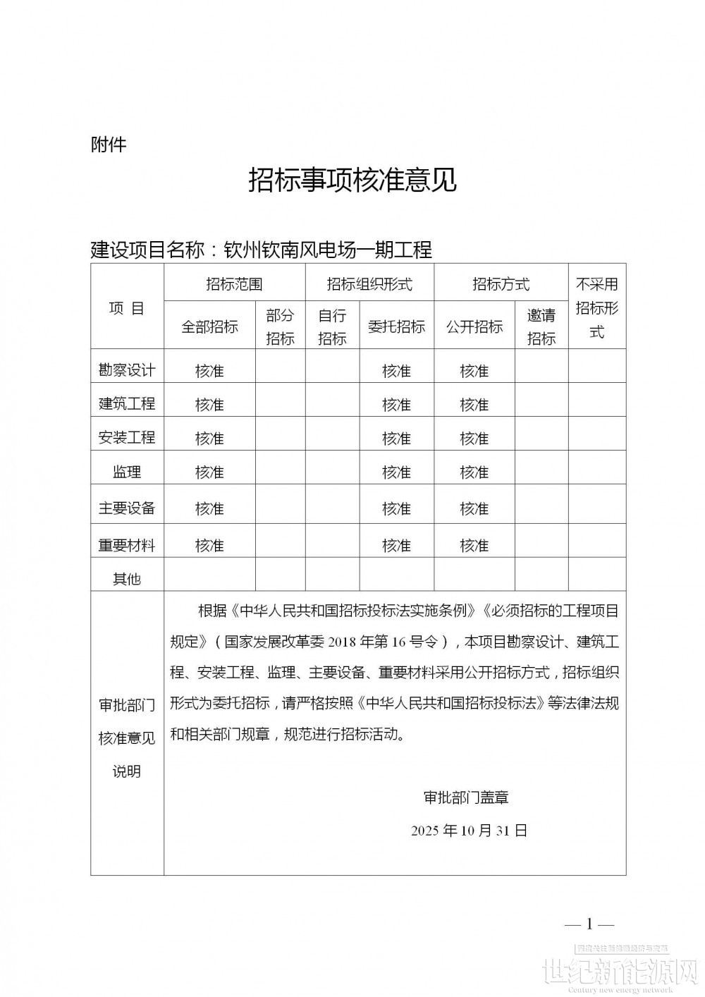 一、为加快钦南区风能资源开发,保障能源供应安全,保护生态环境,推进碳达峰碳中和,依据《中华人民共和国行政许可法》《企业投资项目核准和备案管理条例》《广西壮族自治区企业投资项目核准和备案管理办法》,同意建设钦州钦南风电场一期工程(项目代码:2507-450700-89-01-652594)。