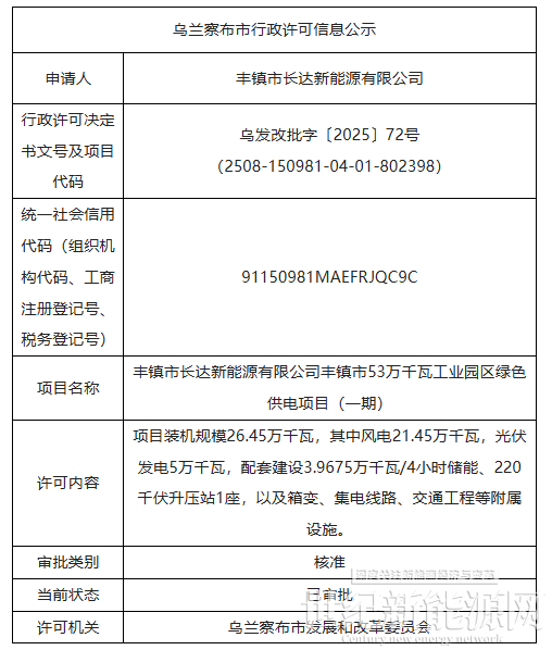 11月3日,乌兰察布市发展和改革委员会发布丰镇市长达新能源有限公司丰镇市53万千瓦工业园区绿色供电项目(一期)核准的批复,项目已核准,项目装机规模26.45万千瓦,其中风电21.45万千瓦,光伏发电5万千瓦,配套建设3.9675万千瓦/4小时储能、220千伏升压站1座,以及箱变、集电线路、交通工程等附属设施。