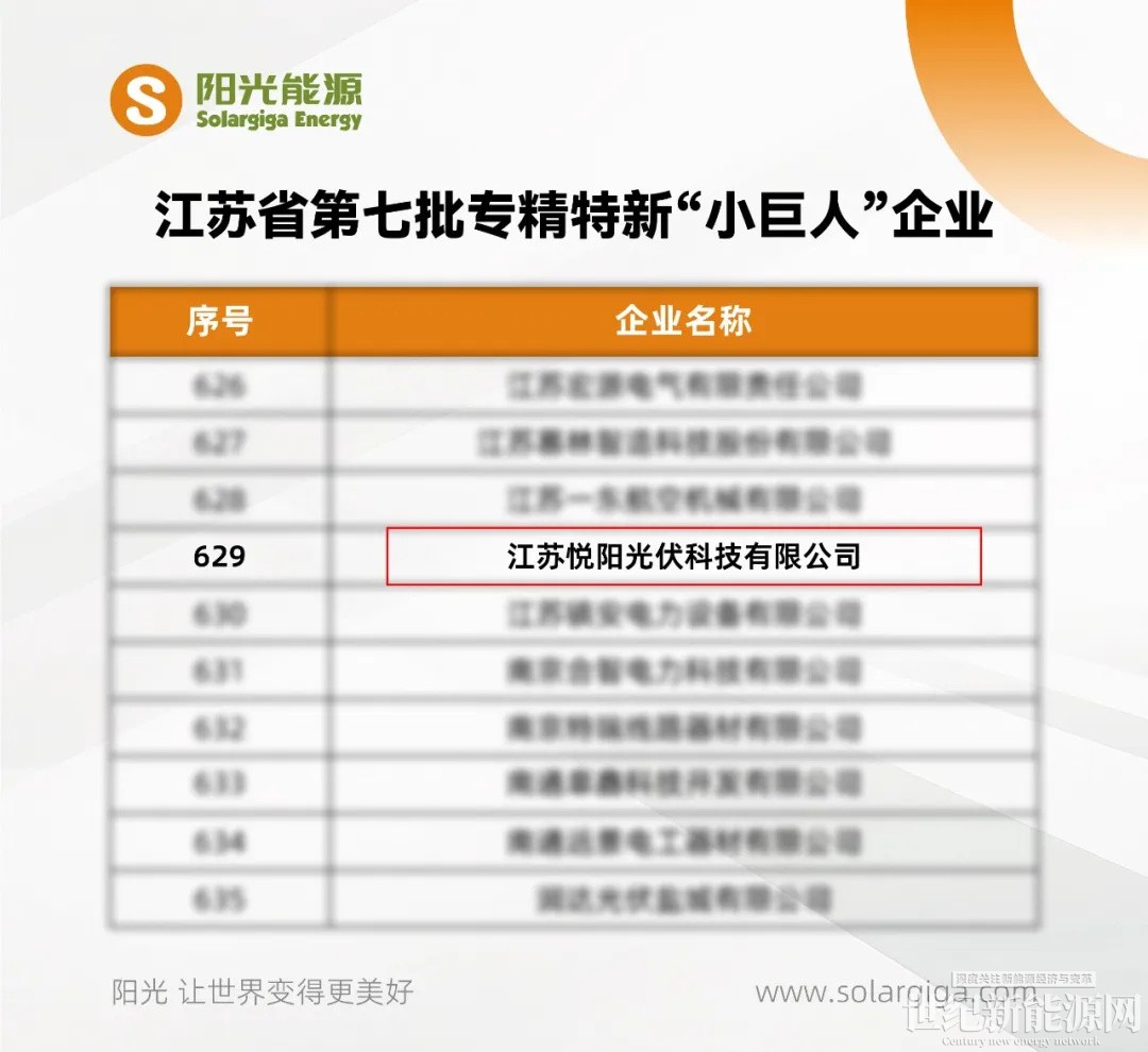 近日,江苏省工业和信息化厅公布江苏省第七批专精特新“小巨人”企业名单,阳光能源控股有限公司(简称“阳光能源”)旗下江苏悦阳光伏科技有限公司 (简称“悦阳基地”),凭借其在高效光伏组件制造领域的卓越技术与创新实力成功入围。