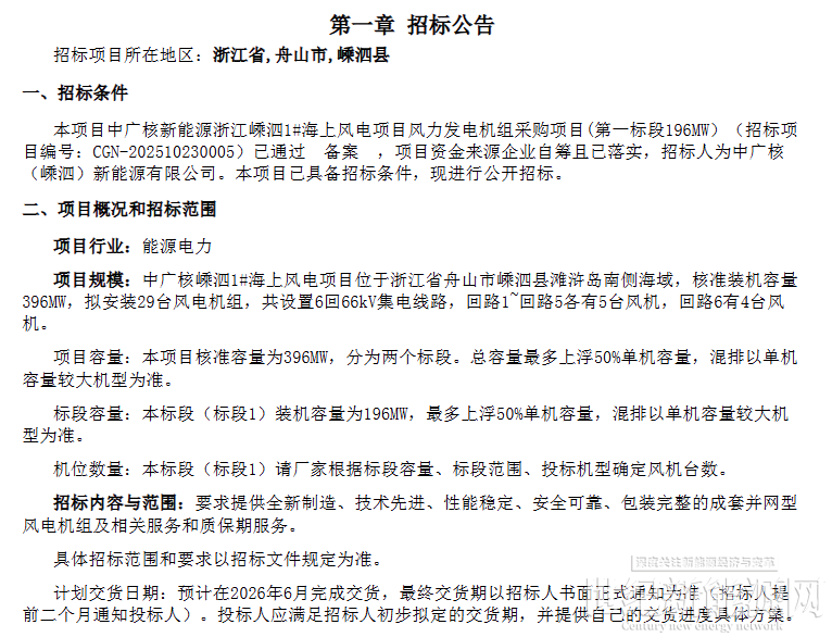 11月4日,中广核发布《中广核新能源浙江嵊泗1#海上风电项目风力发电机组采购项目》招标公告。