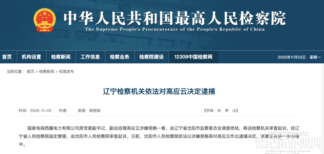 11月3日,最高人民检察院消息,国家电网西藏电力有限公司原党委副书记、副总经理高应云涉嫌受贿一案,由辽宁省沈阳市监察委员会调查终结,移送检察机关审查起诉。经辽宁省人民检察院指定管辖,由沈阳市人民检察院审查起诉。日前,沈阳市人民检察院依法以涉嫌受贿罪对高应云作出逮捕决定。该案正在进一步办理中。