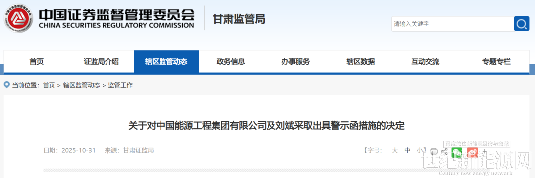 10月31日,中国证监会甘肃证监局发布《关于对中国能源工程集团有限公司及刘斌采取出具警示函措施的决定》,指出中国能源即其董事长刘斌存在两个违反规定的问题,并对中国能源及刘斌出具警示函,责令限期整改。具体如下: