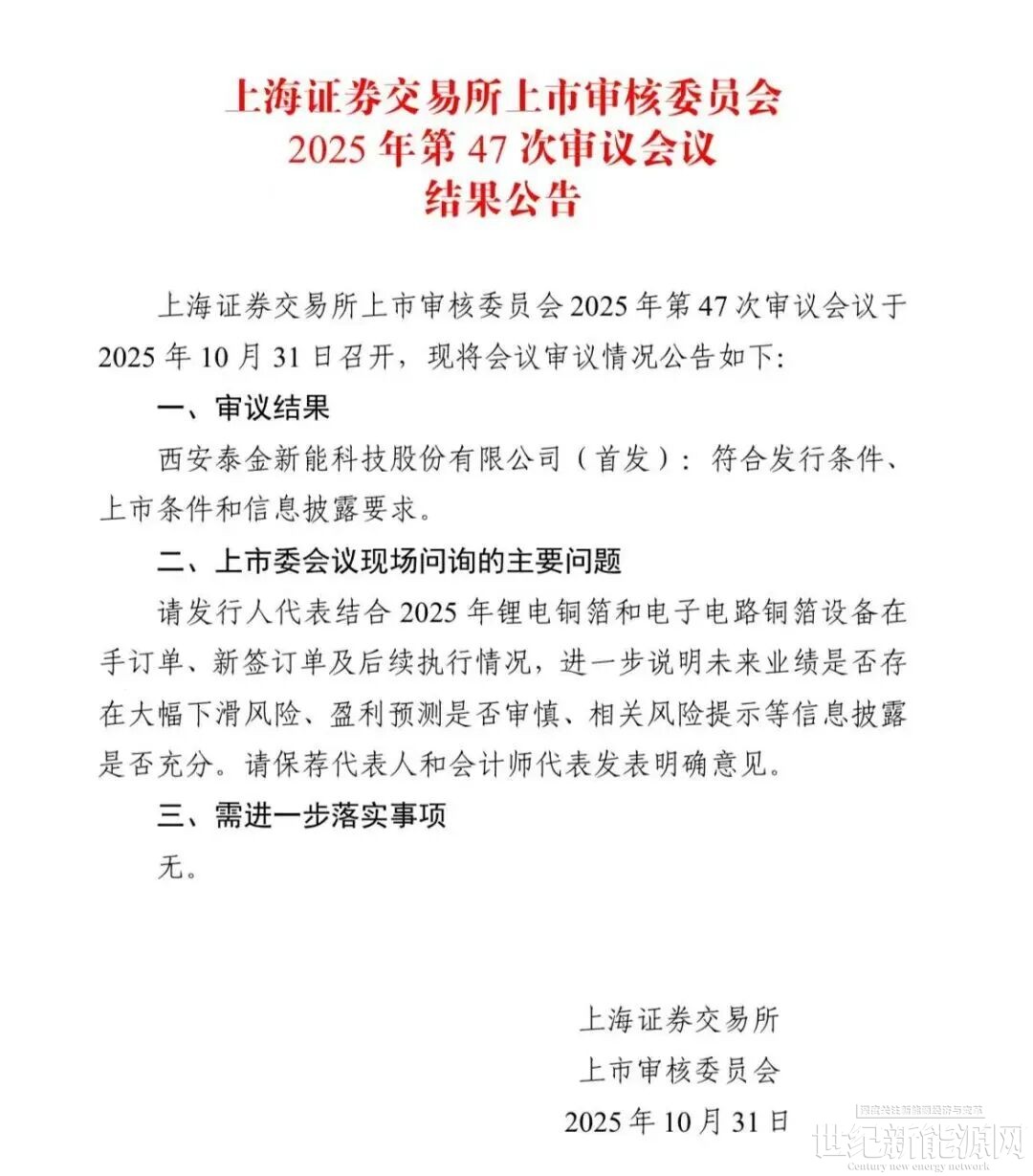 10月31日,西安泰金新能科技股份有限公司(简称“泰金新能”)顺利通过上海证券交易所上市审核委员会2025年第47次审议会议,将登陆上交所科创板。