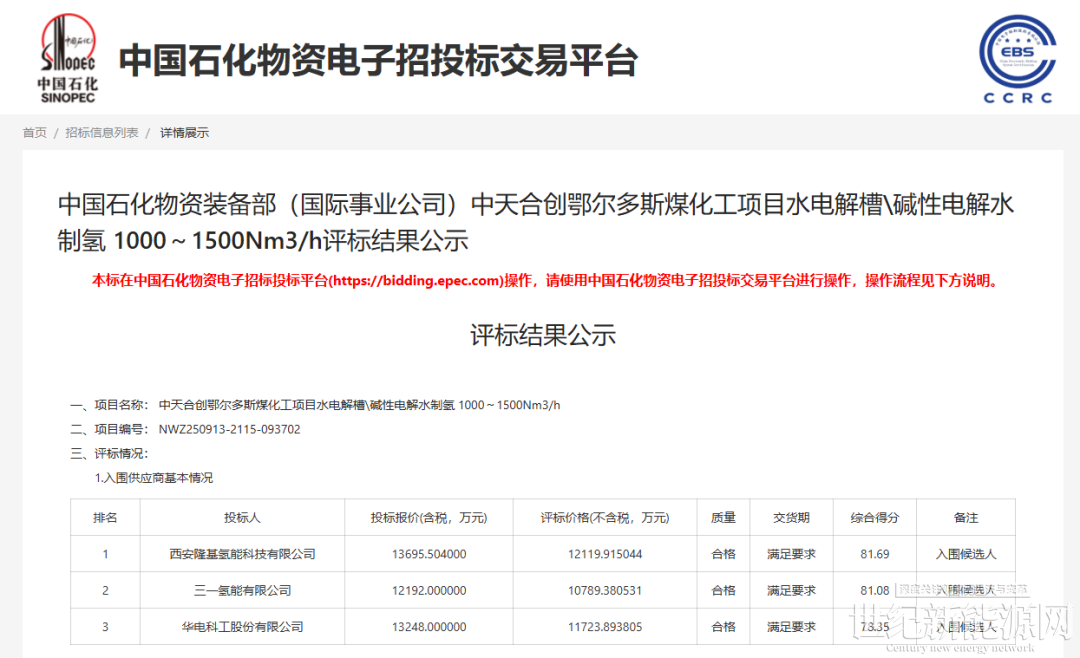 据中国石化物资电子招投标交易平台消息,10月31日,中国石化物资装备部(国际事业公司)中天合创鄂尔多斯煤化工项目水电解槽\碱性电解水制氢 1000~1500Nm³/h评标结果公示。