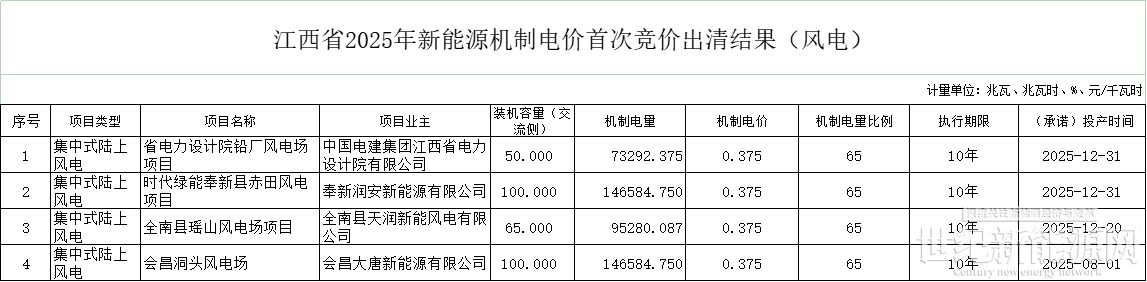 关于公布2025年江西省新能源机制电价首次竞价结果的通知