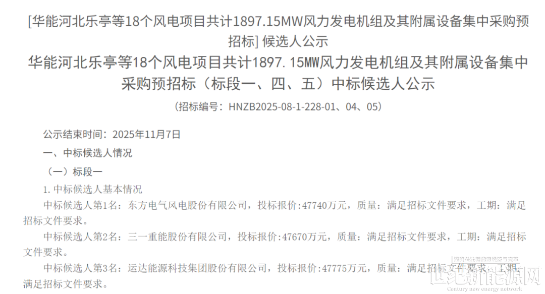 11月4日,中国华能电子商务平台发布《华能河北乐亭等18个风电项目共计1897.15MW风力发电机组及其附属设备集中采购预招标(标段一、四、五)中标候选人公示》,标段一、四、五规模合计756.25MW。