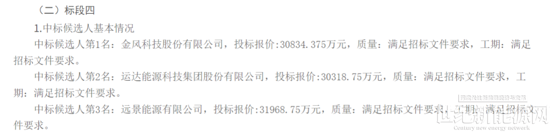 第一中标候选人:金风科技股份有限公司,投标报价:30834.375万元。第二中标候选人:运达能源科技集团股份有限公司,投标报价:30318.75万元。第三中标候选人:远景能源有限公司,投标报价:31968.75万元。