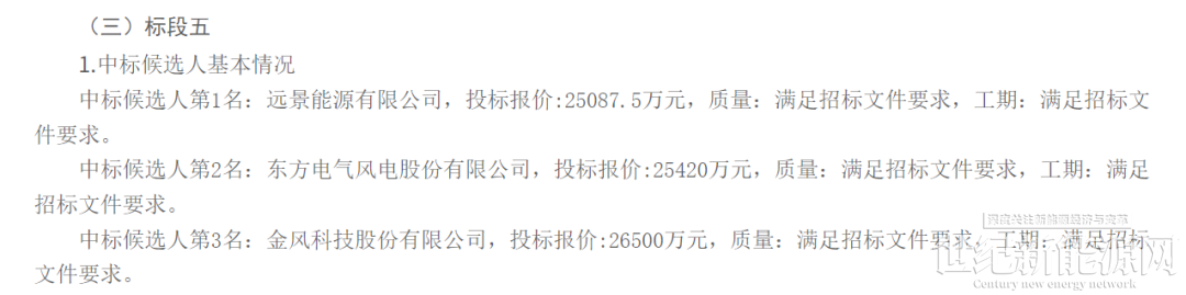 第一中标候选人:远景能源有限公司,投标报价:25087.5万元。第二中标候选人:东方电气风电股份有限公司,投标报价:25420万元。第三中标候选人:金风科技股份有限公司,投标报价:26500万元。