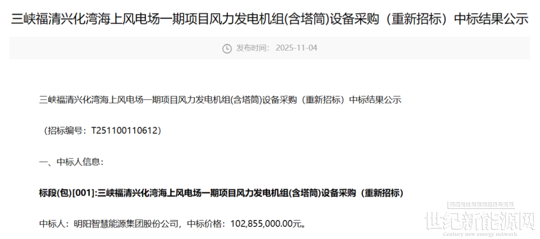 11月4日,中国三峡电子采购平台发布《三峡福清兴化湾海上风电场一期项目风力发电机组(含塔筒)设备采购(重新招标)中标结果公示》的公告。公告显示,明阳智慧能源集团股份公司成功中标该项目,中标价格为102,855,000.00元。