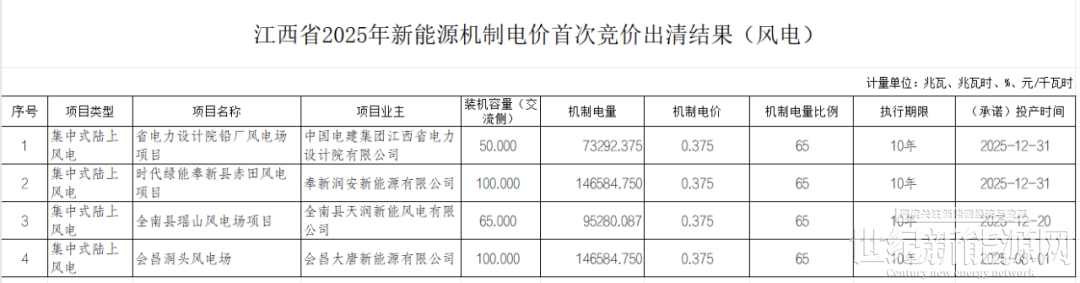根据《关于印发<江西省新能源上网电价市场化改革实施方案>的通知》(赣发改价管〔2025〕718号)、《关于印发<江西省增量新能源项目机制电价竞价实施细则>的通知》(赣发改价管〔2025〕719号)、《江西省发展改革委关于2025年新能源机制电价首次竞价工作有关事项的通知》(赣发改价管〔2025〕721号)等文件规定,我省组织开展了2025年新能源机制电价竞价工作。现将竞价结果及有关事项通知如下: