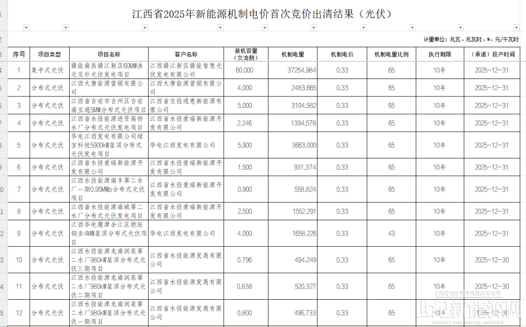 11月5日,江西省发展和改革委员会发布关于公布2025年江西省新能源机制电价首次竞价结果的通知。
