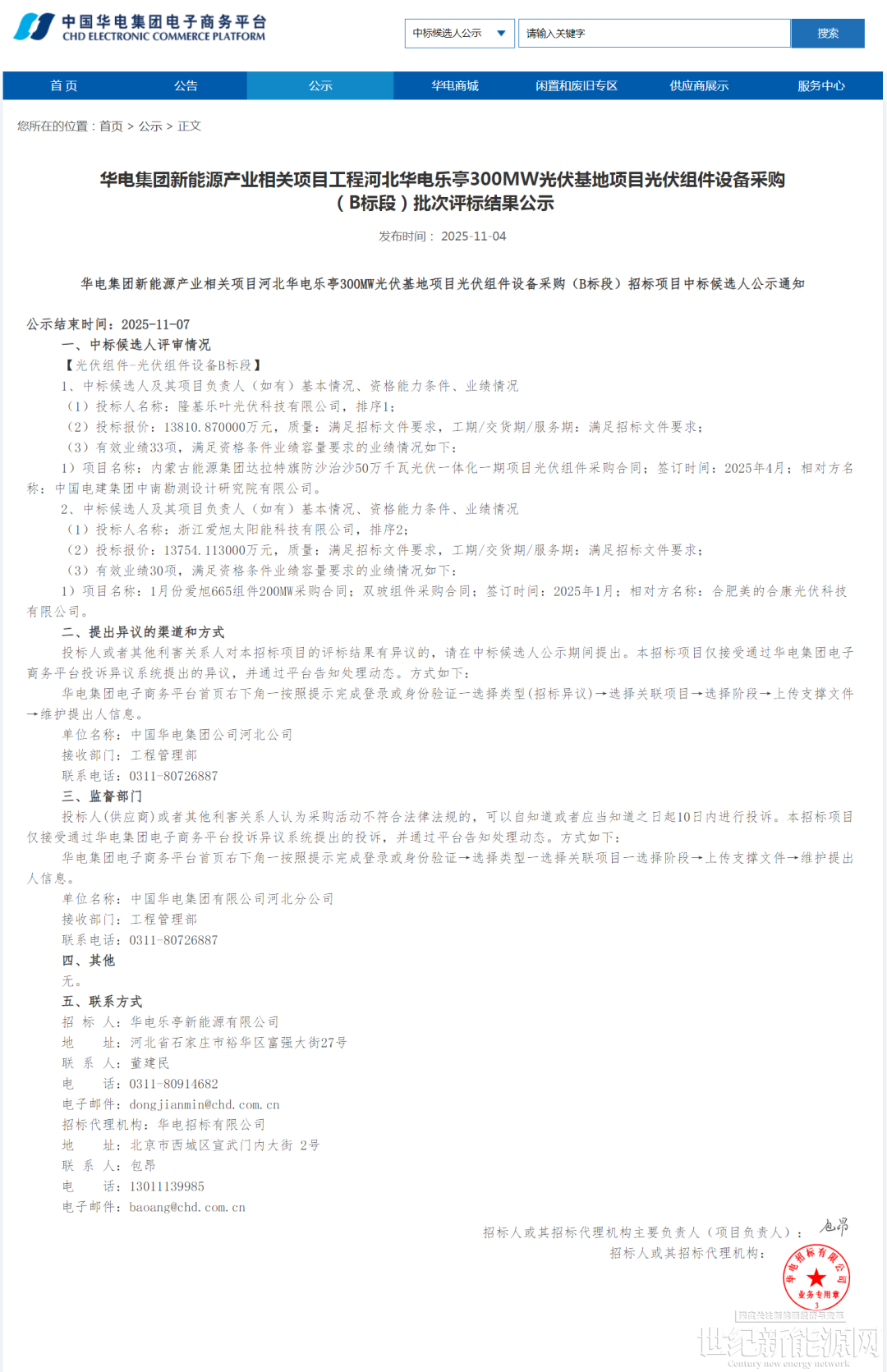 11月4日,河北华电乐亭300MW光伏基地项目光伏组件设备采购A标段、B标段中标候选人公示。两个标段规模合计369.28MW。