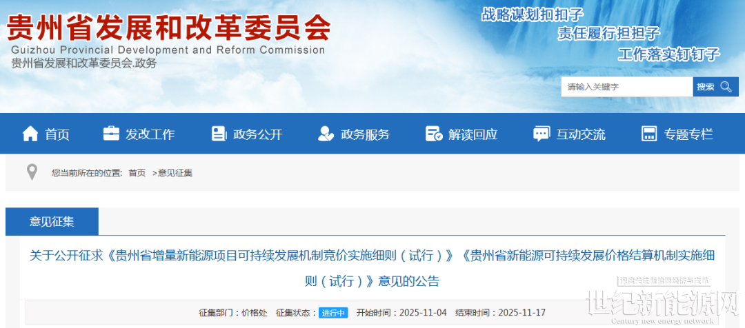 为加快构建新型电力系统、健全绿色低碳发展机制,充分发挥市场在资源配置中的决定性作用,促进新能源高质量发展,根据《国家发展改革委 国家能源局关于深化新能源上网电价市场化改革促进新能源高质量发展的通知》(发改价格〔2025〕136号)、《贵州省关于深化新能源上网电价市场化改革实施方案(试行)》,我委研究起草了《贵州省增量新能源项目可持续发展机制竞价实施细则(试行)(征求意见稿)》《贵州省新能源可持续发展价格结算机制实施细则(试行)(征求意见稿)》,现面向社会公开征求意见。