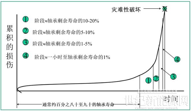 理论上,发电机轴承故障劣化发展呈指数规律变化,寿命中90%的运行时间处于正常状态。阶段①时,轴承已轻微失效,但振动信号微弱,常规手段难察觉;阶段②失效扩大,振动差异仍不明显,表面运行正常,实则风险累积。如未及时检修,就会发展到阶段③,轴承带病运行,次生失效加剧,振动和温度异常显著;阶段④时,多种失效叠加,轴承可能会出现无法继续运行的情况。