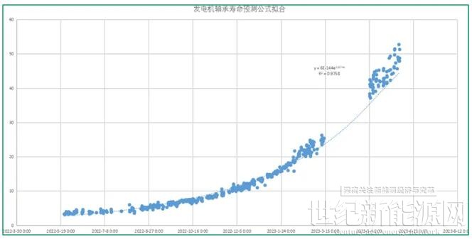此外,协合运维也在开展发电机轴承寿命预测模型的研究,基于12个场站304台风电机组长期振动数据,拟合各个场站轴承的寿命预测曲线,致力于在轴承运行的中后期预测其使用寿命,为风电预测性维护提供有力支撑,在电价不确定的电力市场中,也能为轴承更换时机提供关键决策依据。