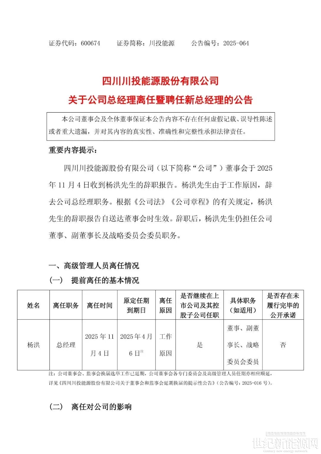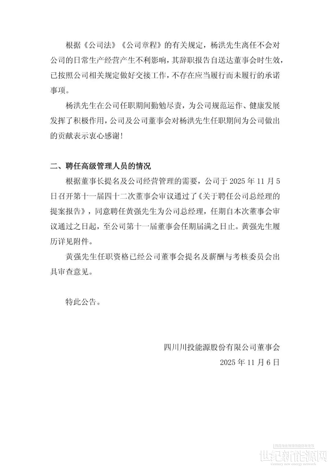 11月6日,杨洪辞去四川川投能源股份有限公司(以下简称“川投能源”)总经理职务,黄强接任。