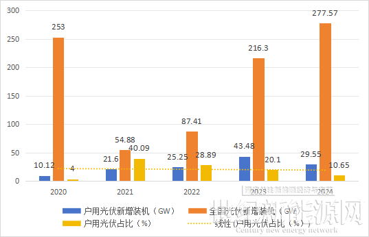根据近五年的新增装机量,可以看到,2020年户用光伏首次突破10GW,但占比仅4%,主要受限于补贴政策与市场认知。2021年整县推进政策试点启动,户用装机同比翻倍,占比跃升至40%,成为分布式光伏主力国家能源局。