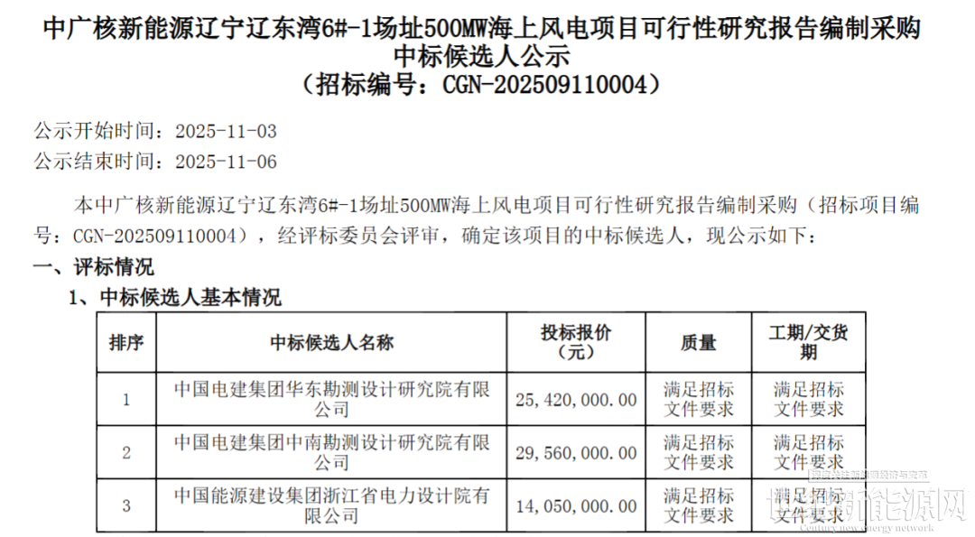 11月4日,中广核新能源辽宁辽东湾6#-1场址500MW海上风电项目可行性研究报告编制采购中标候选人公示。公告显示,第一中标候选人:中国电建集团华东勘测设计研究院有限公司,投标报价:25,420,000.00元。第二中标候选人:中国电建集团中南勘测设计研究院有限公司,投标报价:29,560,000.00元。第三中标候选人:中国能源建设集团浙江省电力设计院有限公司,投标报价:14,050,000.00元。