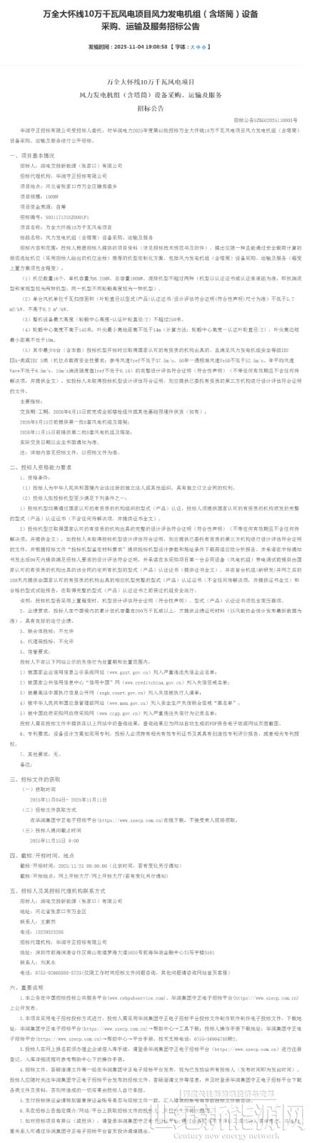 万全大怀线10万千瓦风电项目位于河北省张家口市万全区膳房堡乡,机位数量16个,单机容量为6.25MW,总容量100MW。单台风机单位千瓦扫掠面积(叶轮直径以型式(产品)认证证书/设计评估符合证明(符合性声明)尺寸为准)不低于5.7m2/kW、不高于6.2m2/kW。整机设备最大高度(轮毂中心高度+认证叶轮直径/2)不超过250米。轮毂中心高度不高于143米,叶尖最小离地距离不低于14m(计算方法:轮毂中心高度-认证叶轮直径/2),叶尖离边坡最小距离不低于10m。交货期/工期:2026年6月15日前完成全部锚栓组件或其他基础预埋件供货(如有);2026年8月15日前提供第一批8套风电机组及塔架;2026年11月15日前提供第二批8套风电机组及塔架。