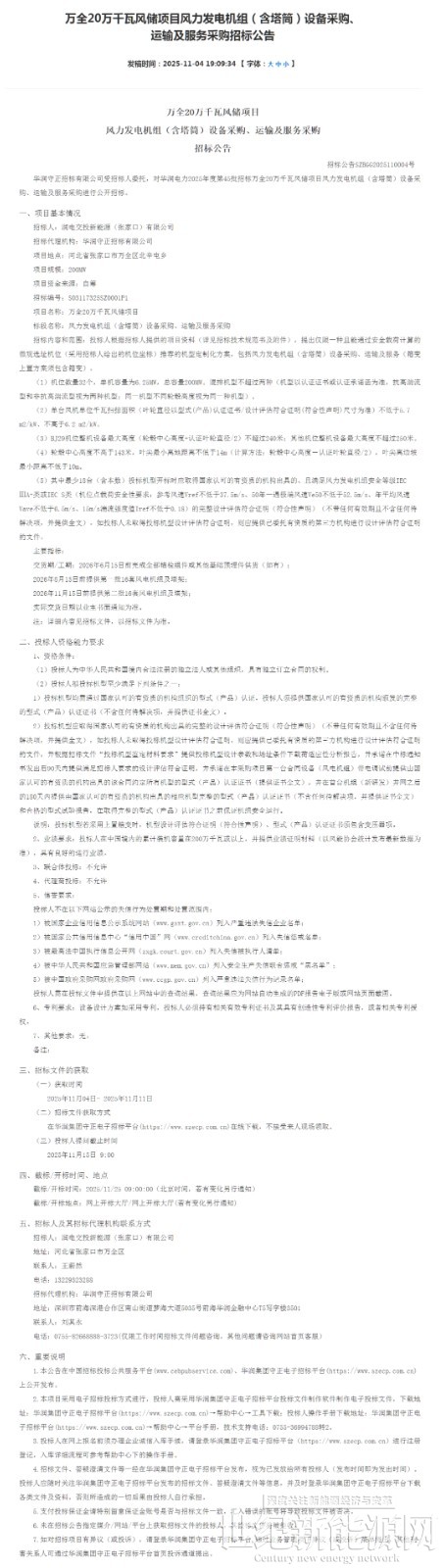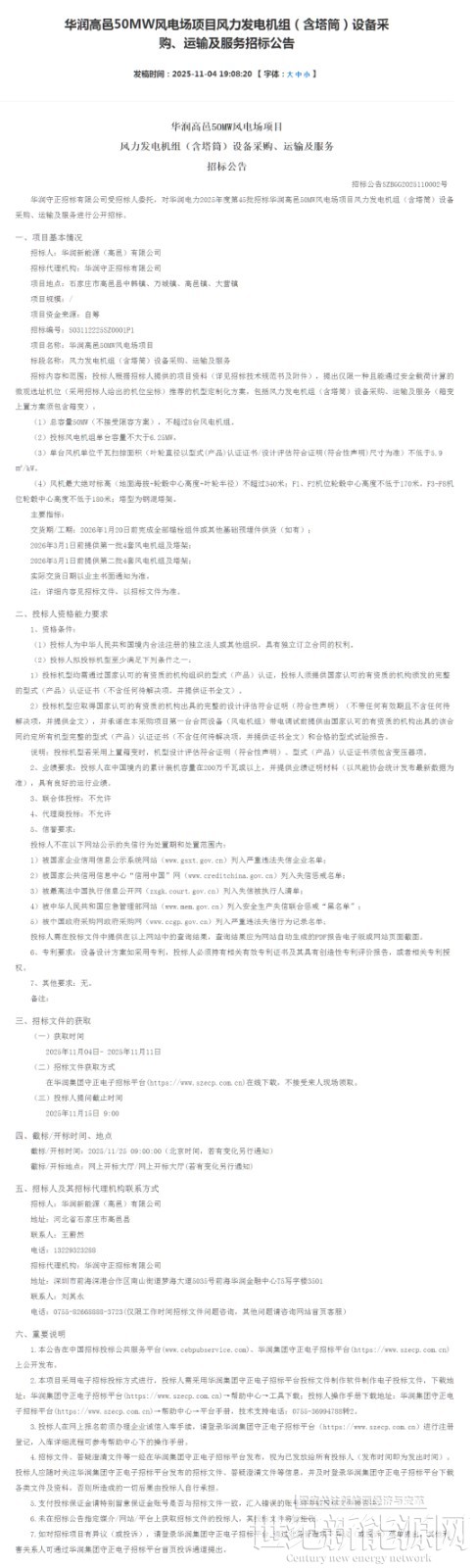 华润高邑50MW风电场项目位于石家庄市高邑县中韩镇、万城镇、高邑镇、大营镇,总容量50MW(不接受限容方案),不超过8台风电机组。投标风电机组单台容量不大于6.25MW。单台风机单位千瓦扫掠面积(叶轮直径以型式(产品)认证证书/设计评估符合证明(符合性声明)尺寸为准)不低于5.9㎡/kW。风机最大绝对标高(地面海拔+轮毂中心高度+叶轮半径)不超过340米;F1、F2机位轮毂中心高度不低于170米,F3-F8机位轮毂中心高度不低于180米;塔型为钢混塔架。交货期/工期:2026年1月20日前完成全部锚栓组件或其他基础预埋件供货(如有);2026年3月1日前提供第一批4套风电机组及塔架;2026年5月1日前提供第二批4套风电机组及塔架。