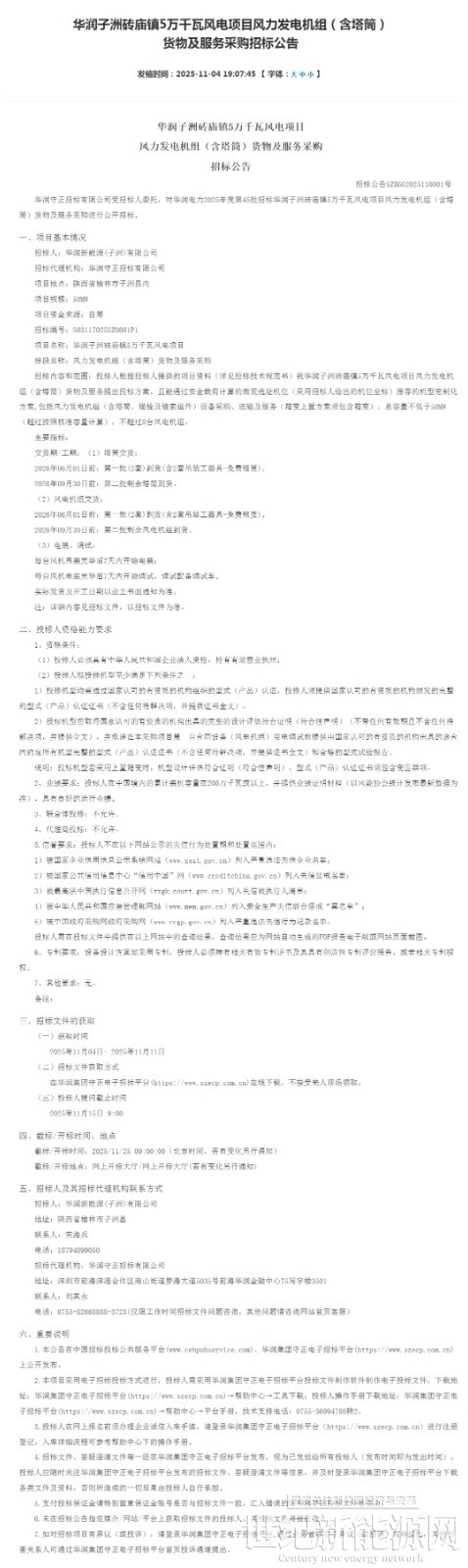 华润子洲砖庙镇5万千瓦风电项目位于陕西省榆林市子洲县内,总容量不低于50MW(超过按照核准容量计算),不超过8台风电机组。交货期/工期:(1)塔筒交货:2026年06月01日前:第一批(2套)到货(含2套吊装工器具-免费租赁)。2026年09月30日前:第二批剩余塔筒到货。(2)风电机组交货:2026年06月01日前:第一批(2套)到货(含2套吊装工器具-免费租赁)。2026年09月30日前:第二批剩余风电机组到货。(3)电装、调试:每台风机吊装完毕后7天内开始电装;每台风机电装完毕后7天内开始调试,调试配备调试车。实际发货及开工日期以业主书面通知为准。