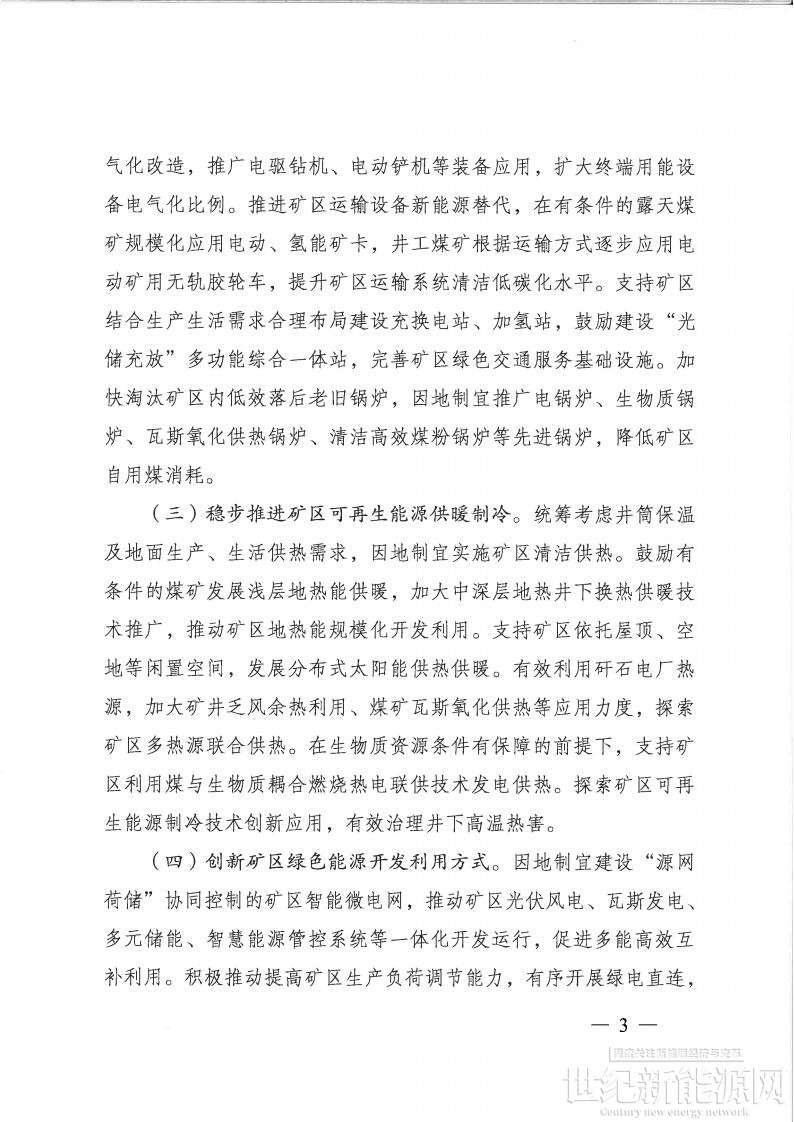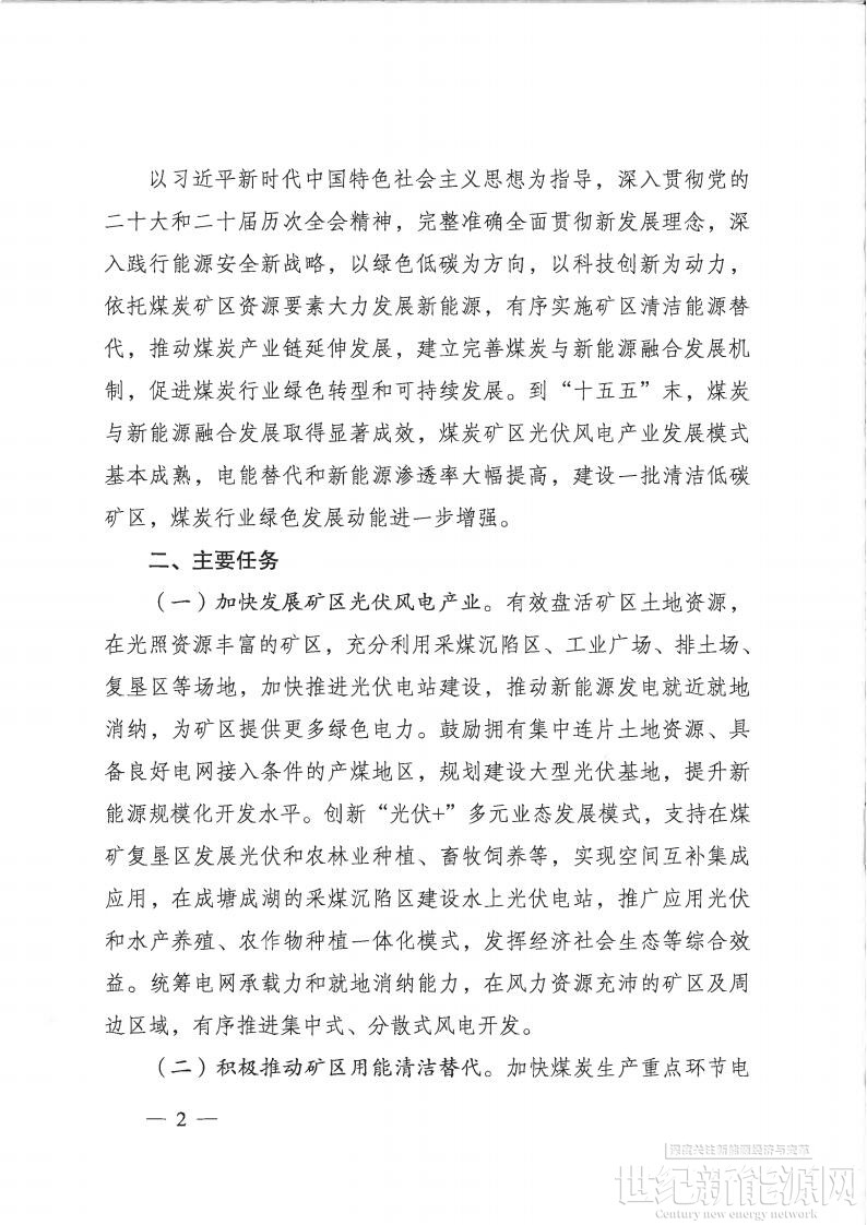 在主要任务上明确,要加快发展矿区光伏风电产业。有效盘活矿区土地资源:在光照资源丰富的矿区,充分利用采煤沉陷区、工业广场、排土场、复垦区等场地,加快推进光伏电站建设,推动新能源发电就近就地消纳,为矿区提供更多绿色电力。鼓励拥有集中连片土地资源、具备良好电网接入条件的产煤地区,规划建设大型光伏基地,提升新能源规模化开发水平。