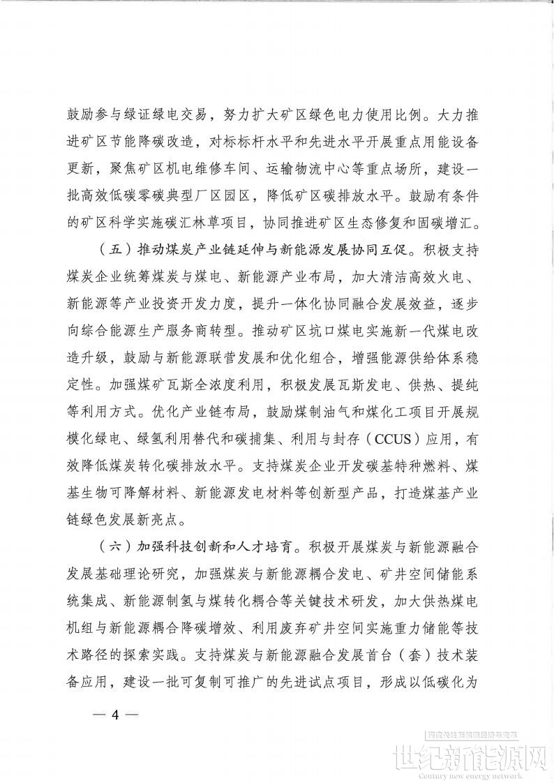 推动煤炭产业链延伸与新能源发展协同互促。积极支持煤炭企业统筹煤炭与煤电、新能源产业布局,加大清洁高效火电、新能源等产业投资开发力度,提升一体化协同融合发展效益,逐步向综合能源生产服务商转型。推动矿区坑口煤电实施新一代煤电改造升级,鼓励与新能源联营发展和优化组合,增强能源供给体系稳定性。加强煤矿瓦斯全浓度利用,积极发展瓦斯发电、供热、提纯等利用方式。优化产业链布局,鼓励煤制油气和煤化工项目开展规模化绿电、绿氢利用替代和碳捕集、利用与封存(CCUS)应用,有效降低煤炭转化碳排放水平。支持煤炭企业开发碳基特种燃料、煤基生物可降解材料、新能源发电材料等创新型产品,打造煤基产业链绿色发展新亮点。