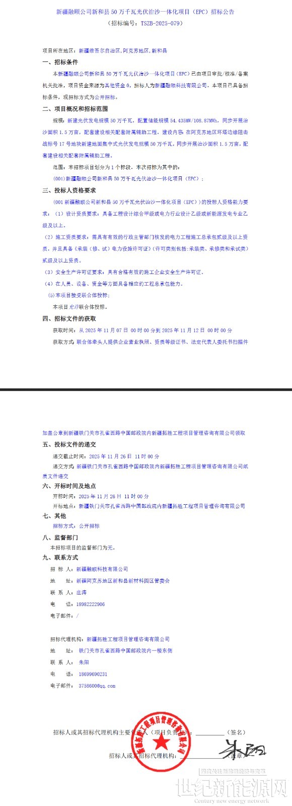 11月6日,新疆融颐公司新和县50万千瓦光伏治沙一体化项目(EPC)招标公告发布。