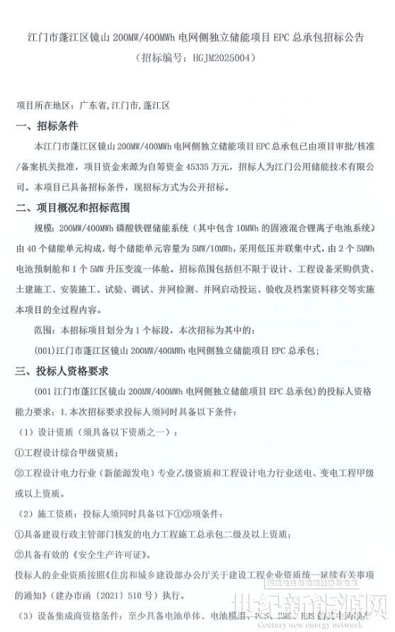 11月10日,江门公用储能技术有限公司发布江门市蓬江区镜山200MW/400MWh电网侧独立储能项目EPC总承包招标公告。项目位于广东省江门市蓬江区,项目规模为200MW/400MWh,采用磷酸铁锂储能系统(其中包含10MWh的固液混合锂离子电池系统),由40个储能单元构成,每个储能单元容量为5MW/10MWh,采用低压并联集中式,由2个5MWh电池预制舱和1个5MW 升压变流一体舱。招标范围包括但不限于设计、工程设备采购供货、土建施工、安装施工、试验、调试、并网检测、并网启动投运、验收及档案资料移交等实施本项目的全过程内容。