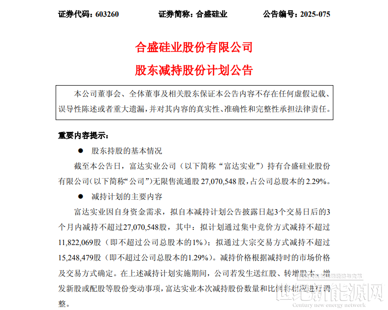 11月10日,合盛硅业(603260)公告称,富达实业因自身资金需求,拟自本减持计划公告披露日起3个交易日后的3个月内减持不超过2707万股,约占公司总股本的2.29%,占其所持比例的100%。
