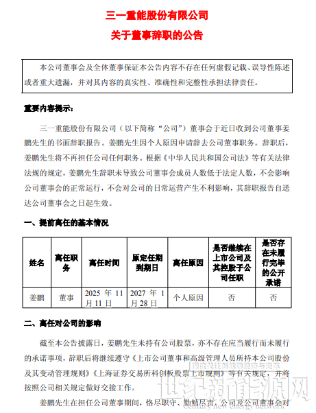 近日,三一重能宣布:董事会近日收到公司董事姜鹏先生的书面辞职报告。姜鹏先生因个人原因申请辞去公司董事职务。辞职后, 姜鹏先生将不再担任公司任何职务。详情如下: