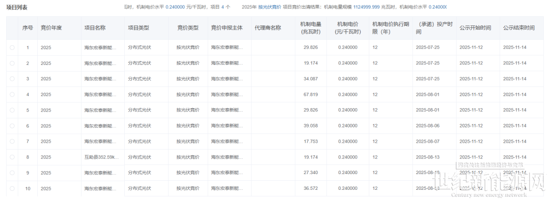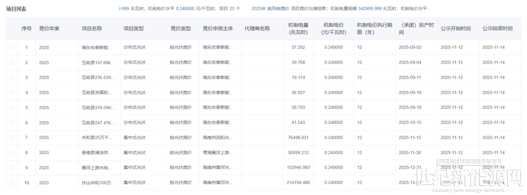 11月12日,青海公示2025年青海省新能源机制电价竞价结果。光伏机制电价0.24元/度,入围项目23个,机制电量1124999.999兆瓦时;从入围项目来看,包括16个分布式光伏项目,7个集中式光伏。风电机制电价0.24元/度,入围项目4个,机制电量542999.999兆瓦时。根据《2025年青海省新能源机制电价竞价组织公告》: