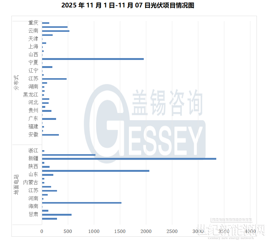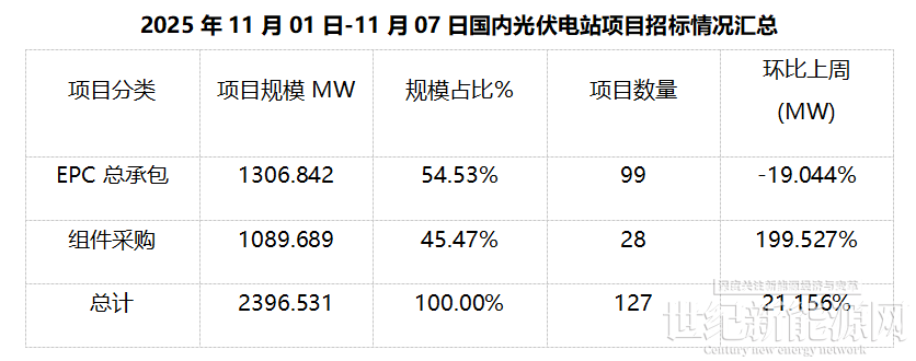根据Gessey盖锡咨询统计,2025年11月01日-11月07日累计光伏招标项目为127个,项目规模合计为2396.531MW。光伏组件采购招标项目为28个,招标规模为1089.689MW,环比上周199.527%。EPC总承包招标项目为99个,招标规模为1306.842MW,环比上周-19.044%。