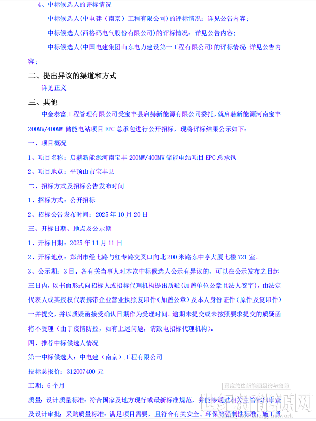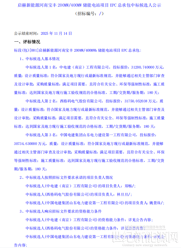 近日,启赫新能源河南宝丰200MW/400MWh储能电站项目EPC总承包中标候选人公示。