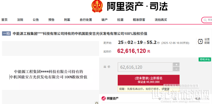 新疆维吾尔自治区哈密市中级人民法院将于12月6日16时在司法拍卖网络平台上,公开拍卖中能源工程集团(上海)环境科技有限公司持有的中机国能安吉光伏发电有限公司100%股权。