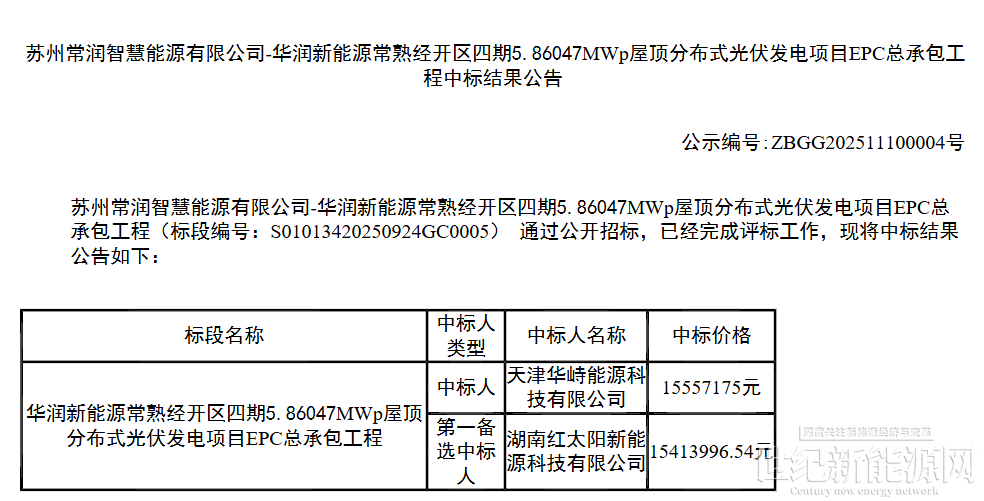 11月12日,江苏华润新能源常熟经开区四期5.86047MWp屋顶分布式光伏发电项目EPC总承包中标结果公示,其中: