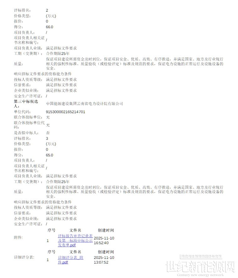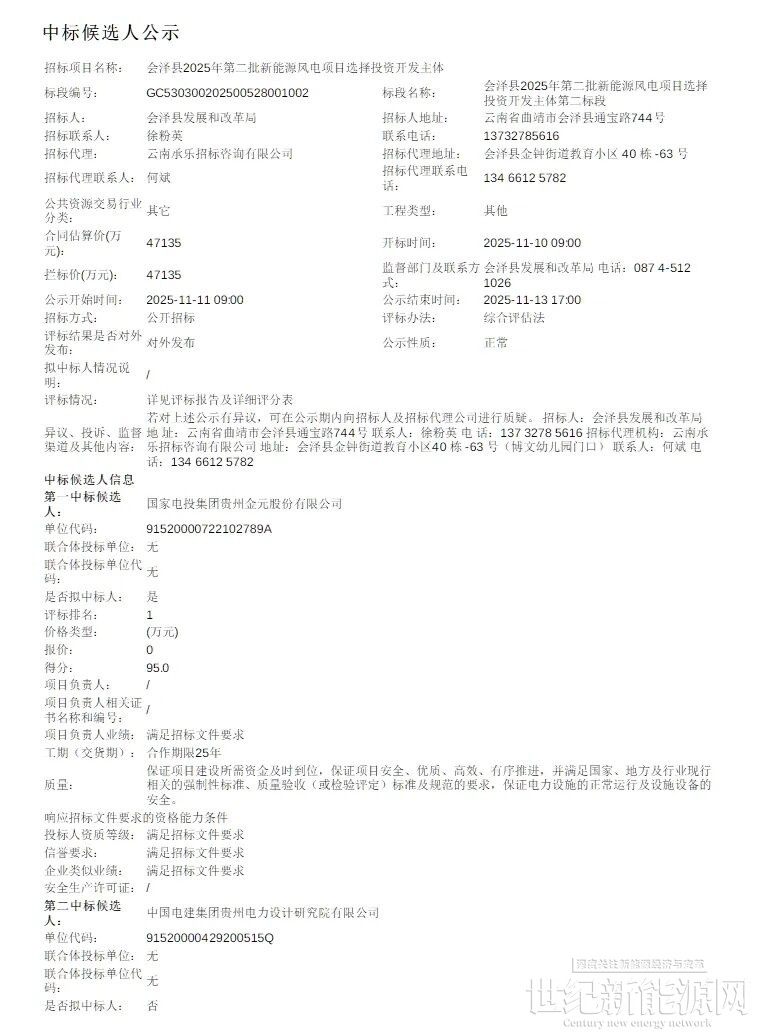 近日,云南会泽县2025年第二批新能源风电项目选择投资开发主体第一标段、第二标段中标候选人公示。
