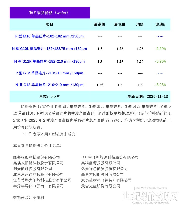 11月13日,中国有色金属工业协会硅业分会发布最新的硅片价格: